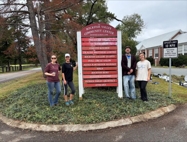 This year, a small but mighty group of our staff members volunteered to provide landscaping at the entrance and at the Bear Garden of the Rockfish Valley Community Center. This historic school building in Nelson County features local businesses and artisans, and provides a wealth of recreational, educational and cultural programs and community-sponsored events. It is also a scenic, well-maintained public space with trails, picnic tables, a playground and a skate park. The ongoing support of volunteers helps make this Community Center possible.